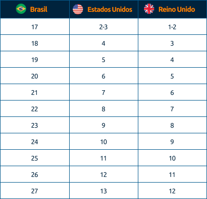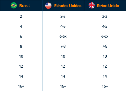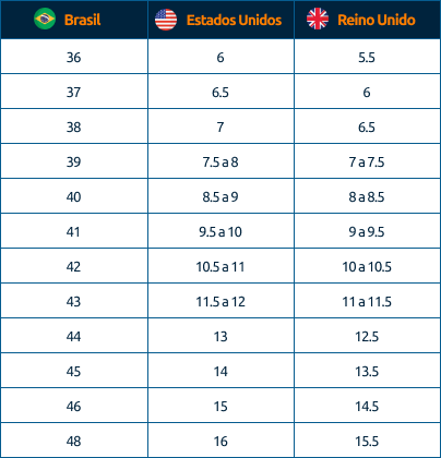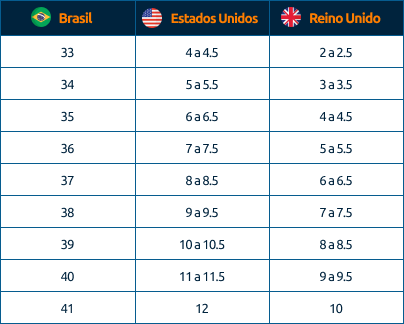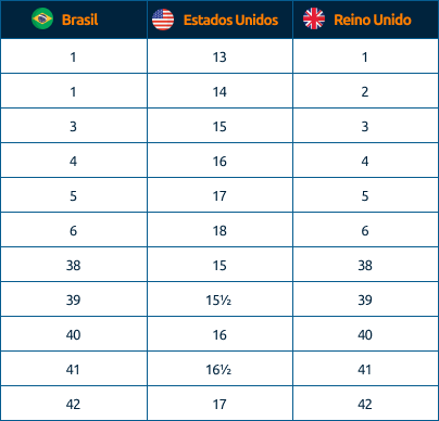 Atenção! Apesar de existirem essas tabelas gerais, é importante estar atento, pois algumas marcas nos EUA estabelecem seus próprios padrões de numeração para tênis. Marcas renomadas como Nike, Adidas e Vans possuem tabelas específicas.